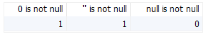 다음 예는 is not null 연산자를 사용하여 null과 비교할 때 0, 빈 문자열 및 null의 결과를 보여줍니다.