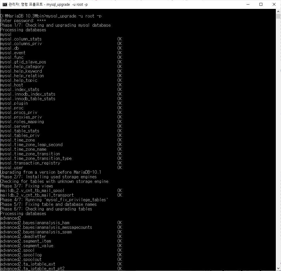 D:\MariaDB 10.3\bin>mysql_upgrade -u root -p
