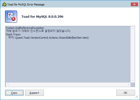 그 이후, Table 조회는 잘 되었지만, Procedures와 Functions 을 누르면 'System.NullReferenceException' 에러가 발생 하였다.