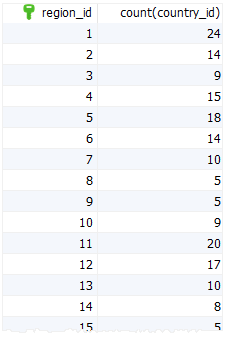 다음 문은 count() 함수와 함께 group by 절을 사용하여 각 지역의 국가 수를 가져옵니다.