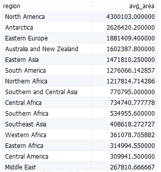 다음 예에서는 avg() 함수와 함께 group by 절을 사용하여 각 지역에 있는 국가의 평균 면적을 계산합니다.