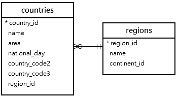nation 샘플 데이터베이스의 countries 및 regions 테이블을 사용합니다.