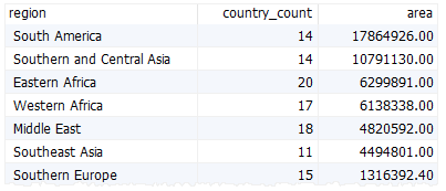 다음 예에서는 having 절을 사용하여 국가가 10개 이상이고 총 면적이 1,000,000 km2 보다 큰 국가를 찾습니다.