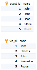 샘플 데이터베이스의 다음 테이블 guests 및 vips를 참조하십시오.