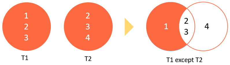 다음 그림은 두 개의 결과 집합 T1(1,2,3) 및 T2(2,3,4)의 except 작업을 보여줍니다.