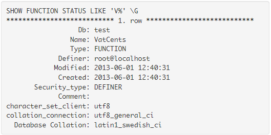 SHOW FUNCTION STATUS LIKE 'V%' ;