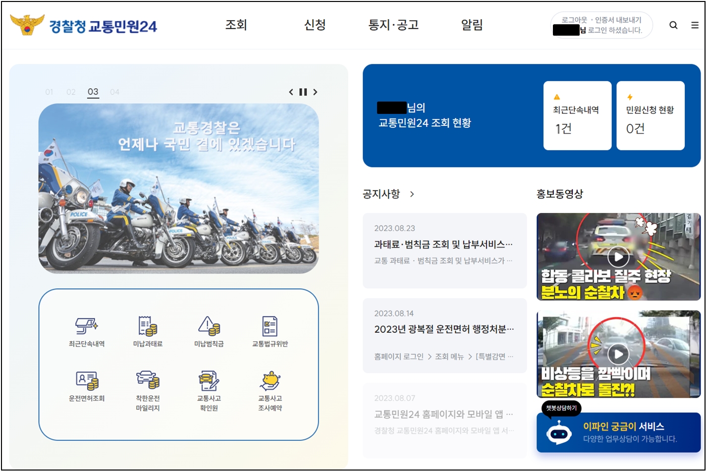 연락을 기다리는 동안 인터넷 경찰청 교통민원24 (www.efine.go.kr)에 접속하여 좀 더 자세한 상황을 알아보고자 했습니다.