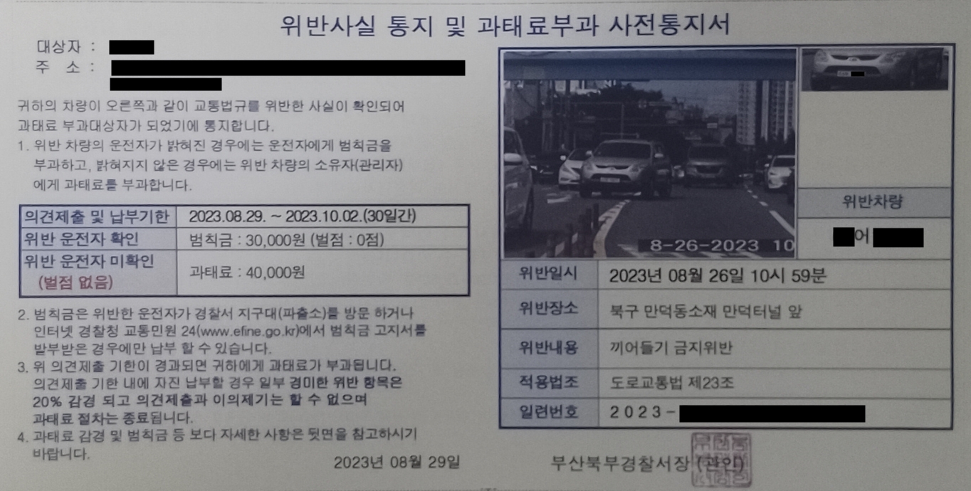 부산북부경찰서로부터 위반관련 과태료부과 사전통지서를 받았습니다.