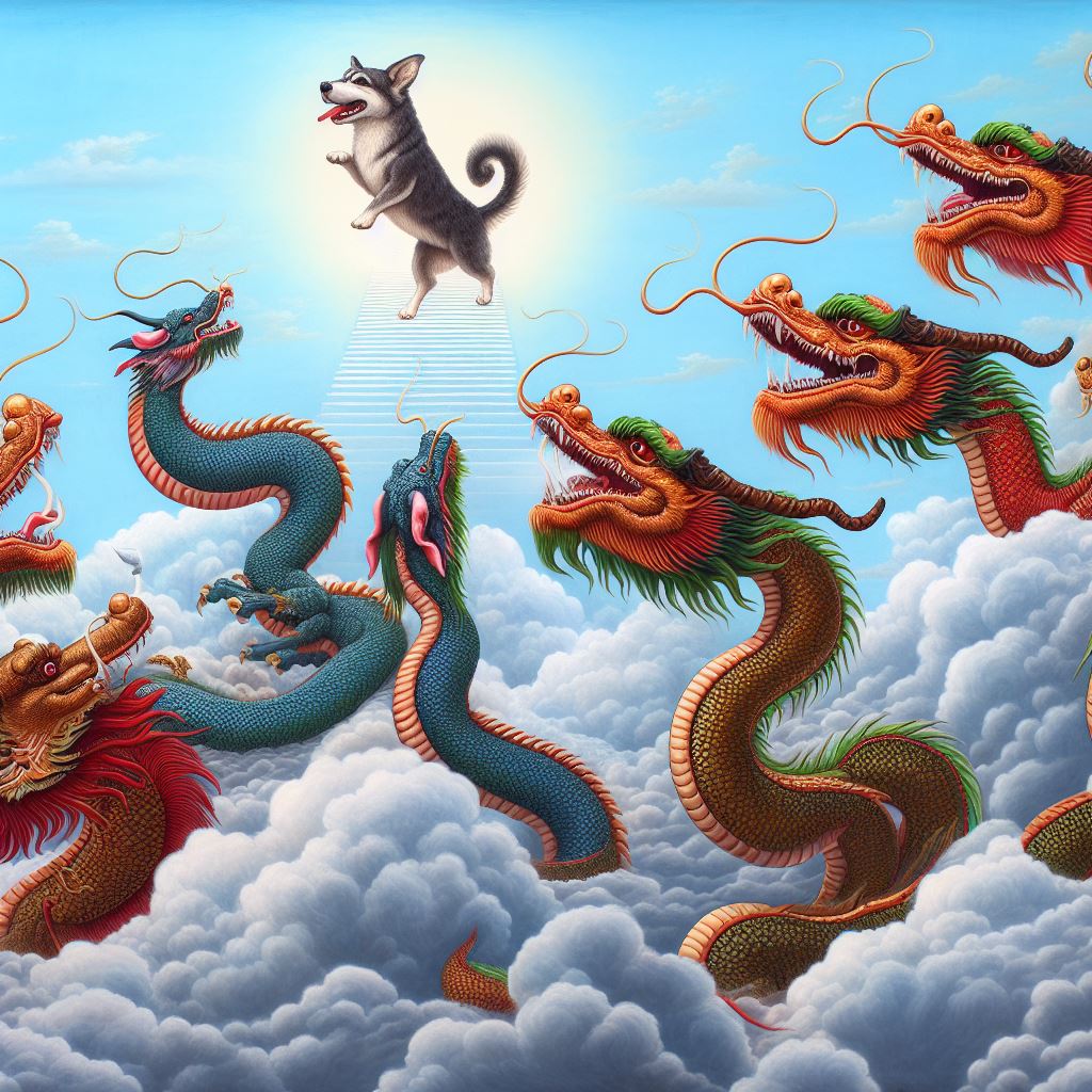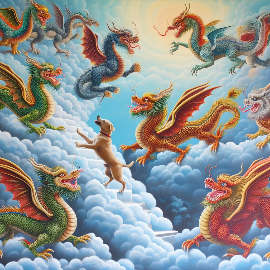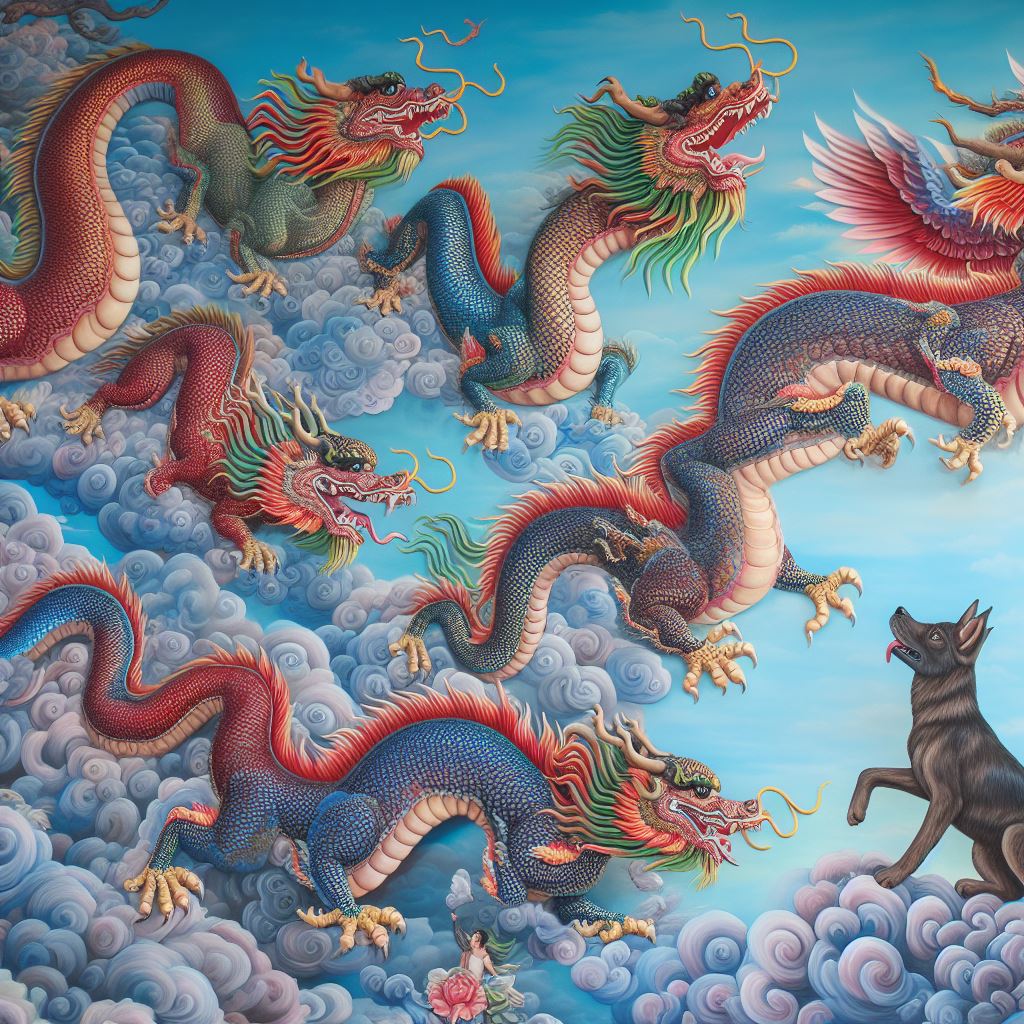 아주 거대한 용 9마리가 승천하는 모습이고 강아지 1마리가 용을 꼬리를 물고 같이 올라가는 그런 모습
