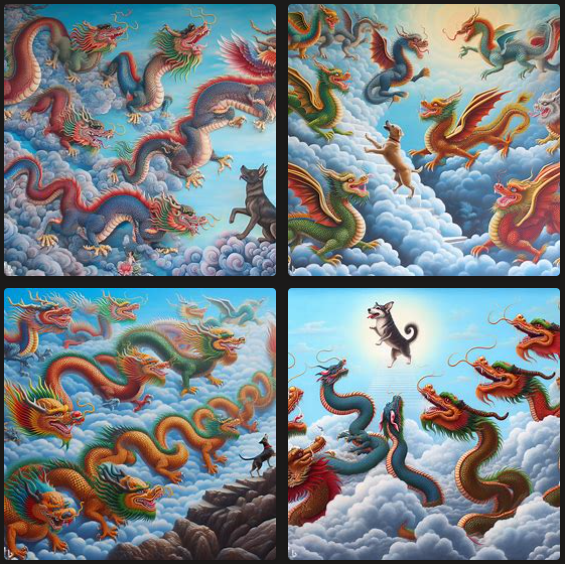 아주 거대한 용 9마리가 승천하는 모습이고 강아지 1마리가 용을 꼬리를 물고 같이 올라가는 그런 모습