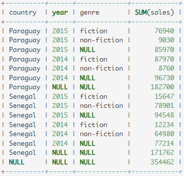 다음 예제에서는 genre, year, 또는 country 가 변경될 때마다 다른 최상위 요약 행이 추가됩니다: