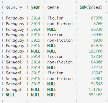 다음 예제에서는 genre, year, 또는 country 가 변경될 때마다 다른 최상위 요약 행이 추가됩니다: