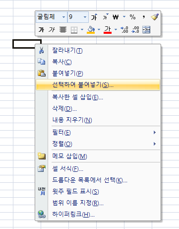 2. 가로 세로를 변환할 곳에 마우스를 위치 시킨 후, 선택하여 붙여넣기 를 선택한다.