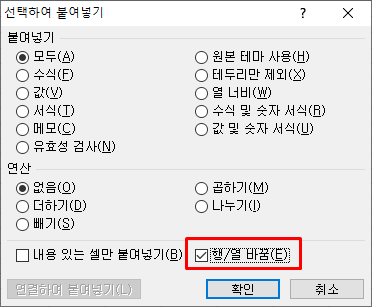 3. 우측 하단의 행/열 바꿈 을 선택한 후, 확인을 한다.