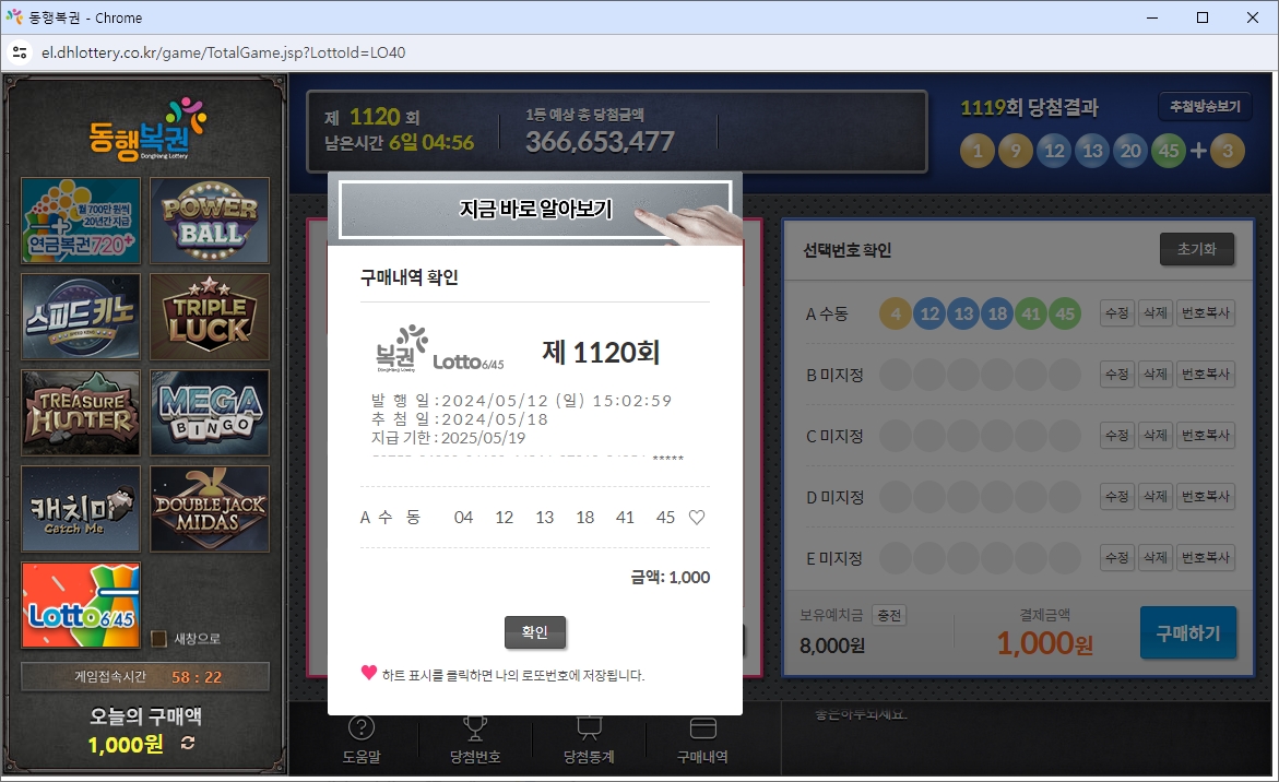 로또 6/45 제1119회 당첨 결과 (2024년 5월 11일 추첨)