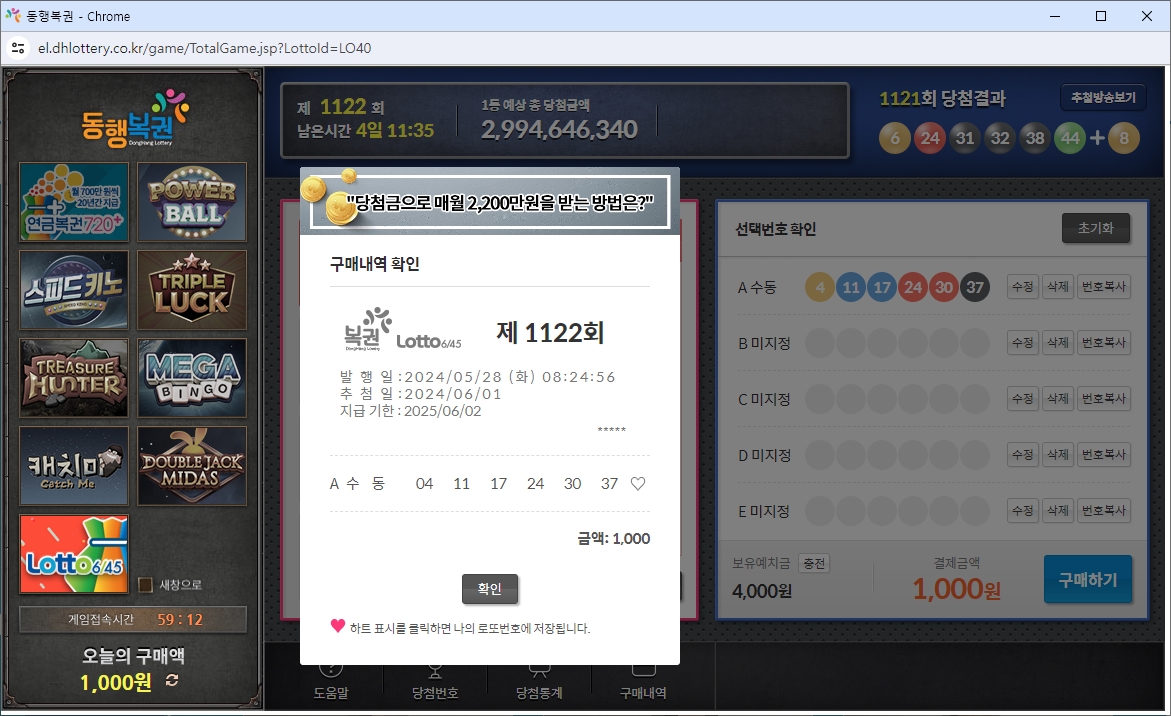 주의: 로또는 도박이며, 과도한 투자는 금물입니다. 자신의 재정 상황을 고려하여 신중하게 구매하시기 바랍니다.