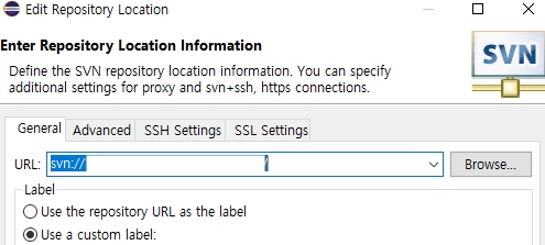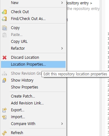 SVN Repositories ▶ Location Properties에서 URL IP 주소 확인 가능하다.