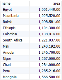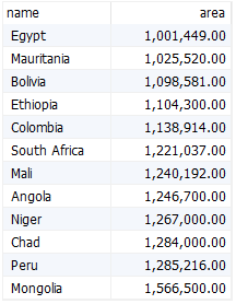 예를 들어 다음 명령문은 where 절에서 between 연산자를 사용하여 면적이 1,001,449에서 1,566,500km2 사이인 국가를 찾습니다.