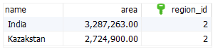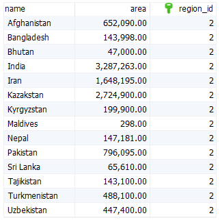 다음 문은 where 절에서 or 연산자를 사용하여 지역 2에 위치하거나 면적이 2,000,000 km2보다 작은 국가를 찾습니다.