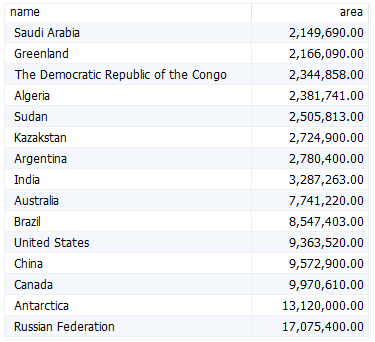 다음 문은 where 절을 사용하여 면적이 2,000,000 km2보다 큰 국가를 찾습니다.