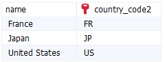 다음 문은 where 절에서 in 연산자를 사용하여 국가 코드가 US, FR 및 JP 국가 코드인 국가를 찾습니다.