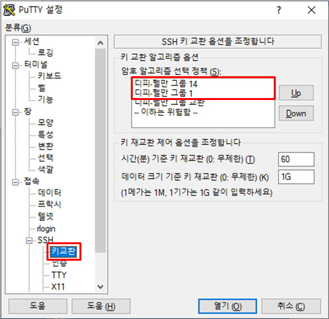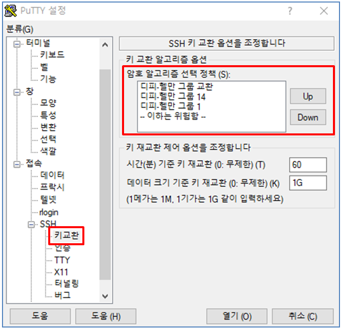 이를 해결하기 위해 PuTTy 설정 창에서 분류(G)의 "접속 > SSH > 키교환" 으로 이동한다.