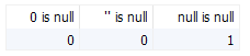다음 예는 0, 빈 문자열 및 null을 null과 비교할 때 is null 연산자의 결과를 보여줍니다.