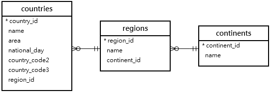 샘플 데이터베이스에서 다음 세 테이블 국가, 지역 및 대륙을 고려합니다.