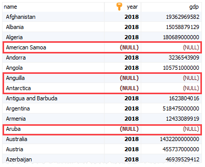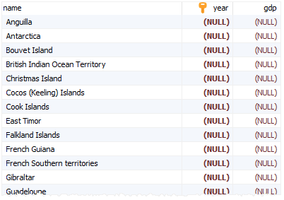 GDP 정보가 없는 국가를 찾으려면 다음 쿼리를 사용합니다.