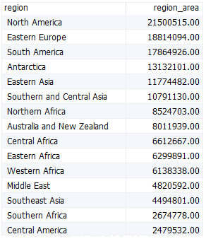 다음 예에서는 sum() 함수와 함께 group by 절을 사용하여 각 지역에 있는 국가의 총 면적을 계산합니다.