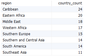 다음 예에서는 having 절을 사용하여 10개 이상의 국가가 있는 지역을 찾습니다.