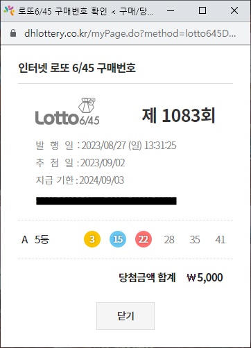 지난 1083회 로또 당첨번호는 3,7,14,15,22,38 번이야. 네가 추천해 준 3,15,22,28,35,41 번호로 구매했더니. 5등에 당첨되었어.