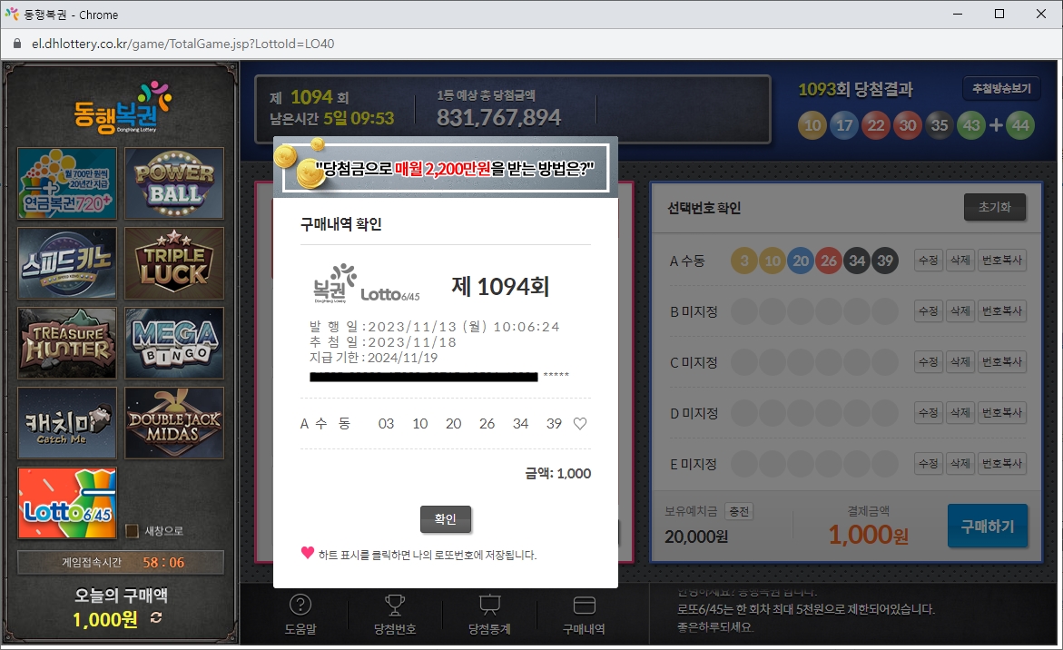 1094회 로또 당첨 예상 번호 (2023.11.18. 추첨), feat. Cue: