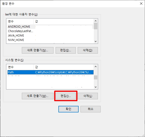 ※. 사용자 부분과 파이썬 폴더는 본인에 맞게 바꾸어 적용해야 한다. 본인의 경우, 'lee'로 변경함