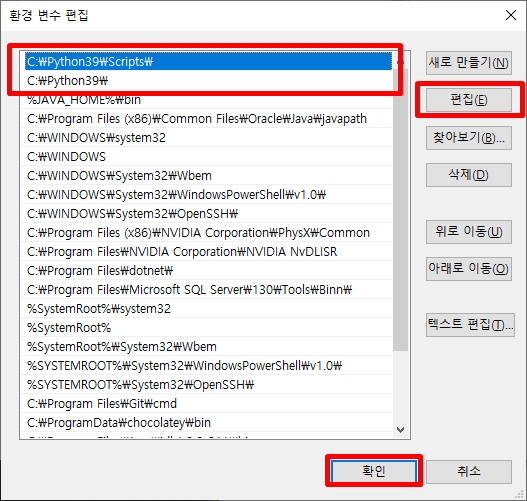 설정 → 시스템 → 정보 → 고급 시스템 설정 → 환경 변수 → 시스템 변수 (Path) 편집 → 환경 변수 편집