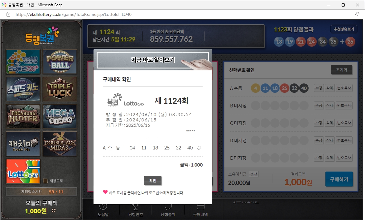 1124회 로또 당첨 예상 번호 (2024.6.15. 추첨), feat. Gemini