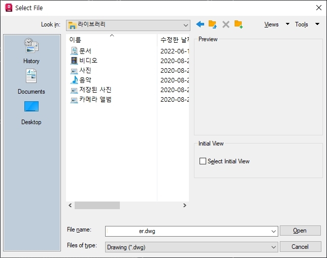 DWG 파일을 선택하여 열어볼 수 있습니다.