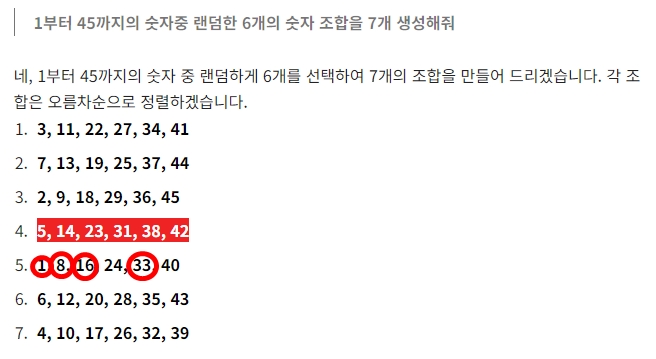 1부터 45까지의 숫자중 랜덤한 6개의 숫자 조합을 7개 생성해줘