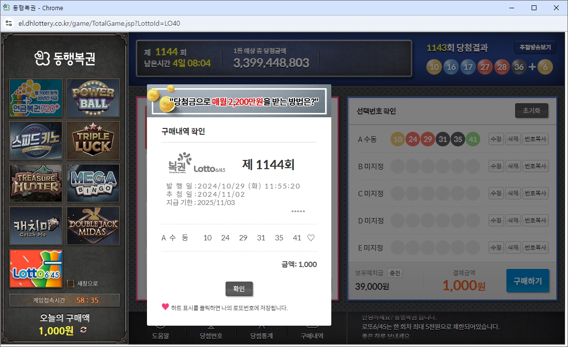 1143회 당첨결과 (2024-10-26 추첨)