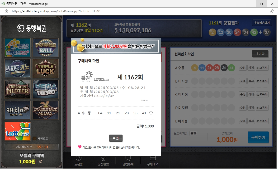 1161회 당첨결과 (2025-03-01 추첨)