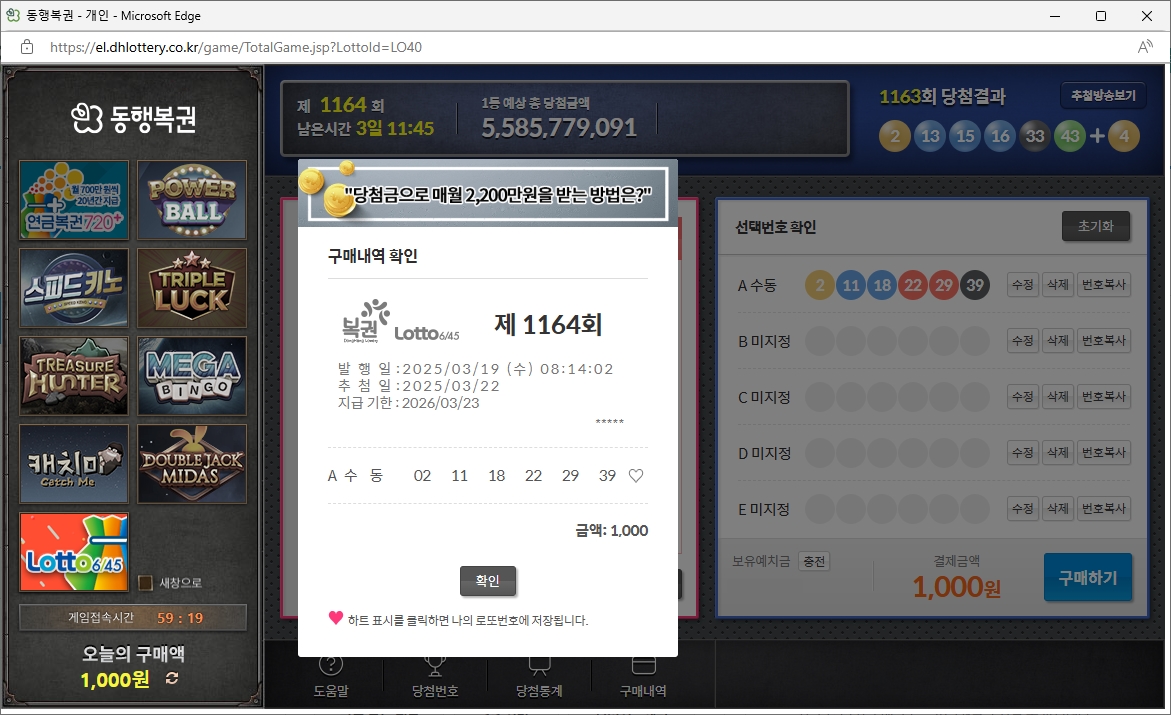 1164회 로또 당첨 예상 번호 (2025.03.22. 추첨), feat. Claude
