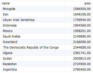 다음 예에서는 between 연산자를 사용하여 면적이 1,566,500 에서 2,780,400 사이인 국가를 찾습니다.